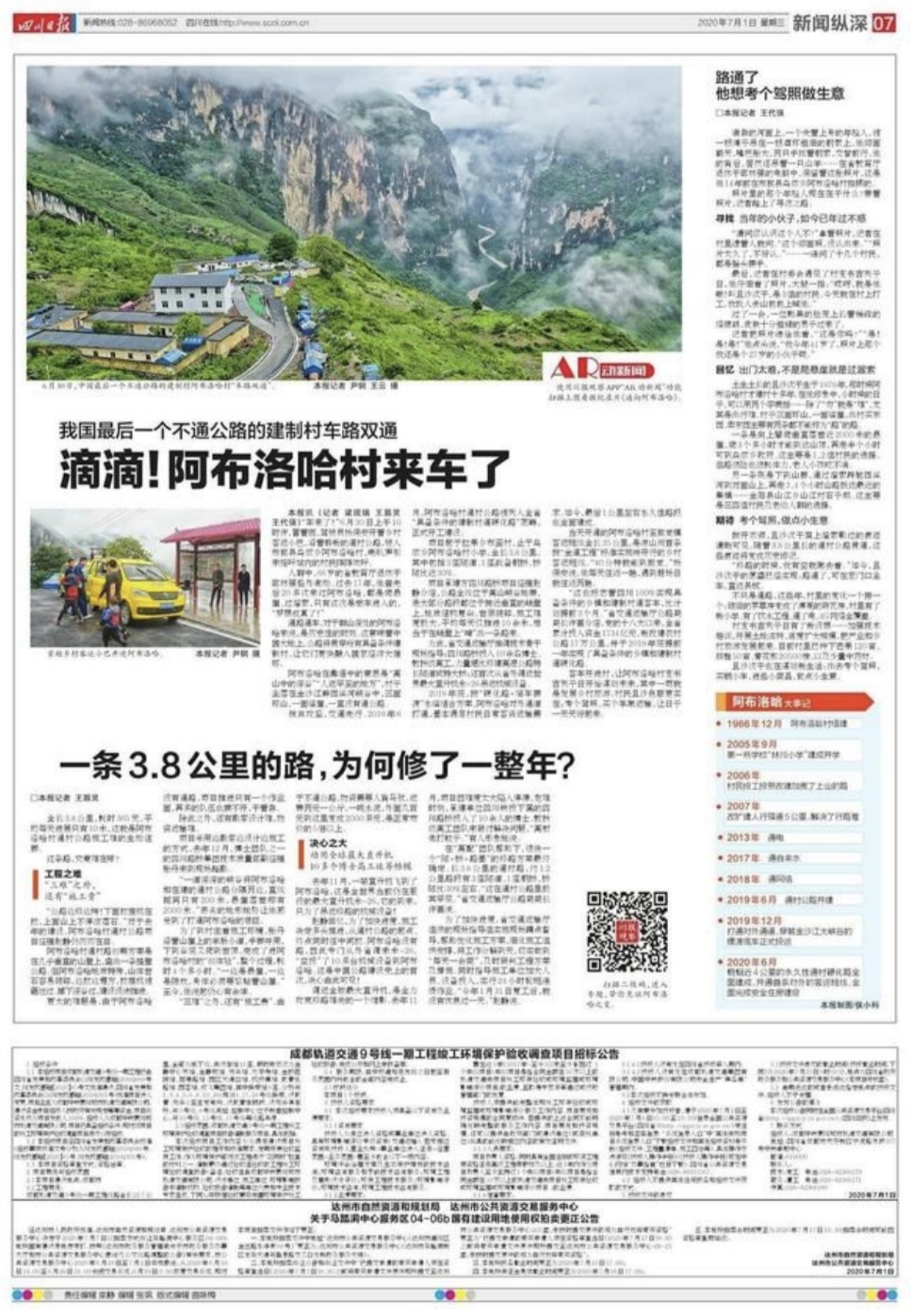 我国最后一个不通公路的建制村车路双通 滴滴!阿布洛哈村来车了 四川日报,2020-07-01,第 7 版 本报讯(记者 梁现瑞 王眉灵 王代强)“车来了!”6 月 30 日上午 10 时许, 冒着雨,驾驶员杨保安开着乡村客运小巴,沿着崭新的通村公路,驶入布拖县乌 依乡阿布洛哈村,喇叭声引来招呼站内的村民阵阵欢呼。 人群中,66 岁的省教育厅退休干部林强格外激动。过去 17 年,他曾先后 20 多次来过阿布洛哈,都是爬悬崖、过溜索,只有这次是乘车进入的,“梦想成真 了!” 通路通车,对于群山深处的阿布洛哈来说,是历史性的时刻。这意味着中国 大地上,公路将贯穿所有具备条件建制村,让它们更快融入国家经济大循环。 阿布洛哈在彝语中的意思是“高山中的深谷”“人迹罕至的地方”,村子坐落 在金沙江畔西溪河峡谷中,三面环山,一面临崖,一直没有通公路。 脱贫攻坚,交通先行。2019 年 6 月,阿布洛哈村通村公路被列入全省“具备 条件的建制村通硬化路”范畴,正式开工建设。 项目起于拉果乡布歪村,止于乌依乡阿布洛哈村小学,全长 3.8 公里,其中 包括 3 座隧道、1 座战备钢桥,桥隧比近 30%。 项目承建方四川路桥项目经理赵静介绍,公路全线位于高山峡谷地带,绝大 部分路段都位于接近垂直的峭壁上,地质结构复杂,岩层破碎,施工难度极大, 平均每天仅推进 10 余米,相当于在峭壁上“啃”出一条路来。 为此,省交通运输厅抽调技术骨干现场指导;四川路桥投入 10 余名博士、 教授级高工,力量堪比修建高速公路特长隧道或特大桥;还首次从省外调运世界 最大直升机米-26 吊运机械设备。 2019 年底,按“硬化路+缆车摆渡”永临结合方案,阿布洛哈对外通道打通, 基本满足村民日常客货运输需求。如今,最后 1 公里左右永久性路段也全面建成。 当天开通的阿布洛哈村至拖觉镇客运班线全长 35 公里,是凉山州首条按“金 通工程”标准实施并开行的乡村客运班线。“40 分钟就能到拖觉。”杨保安说,他 每天往返一趟,遇到赶场日就往返两趟。 “这也标志着四川 100%实现具备条件的乡镇和建制村通客车,比计划提前 3 个月。”省交通运输厅公路局局长许磊介绍,党的十八大以来,全省累计投入资 金 1734 亿元,新改建农村公路 17 万公里,并于 2019 年底提前一年实现了具备 条件的乡镇和建制村通硬化路。 客车开进村,让阿布洛哈村支书吉列子日开始谋划未来,其中一项就是发展 乡村旅游。村民且沙色聪更实在:考个驾照,买个车跑运输,让日子一天天好起 来。